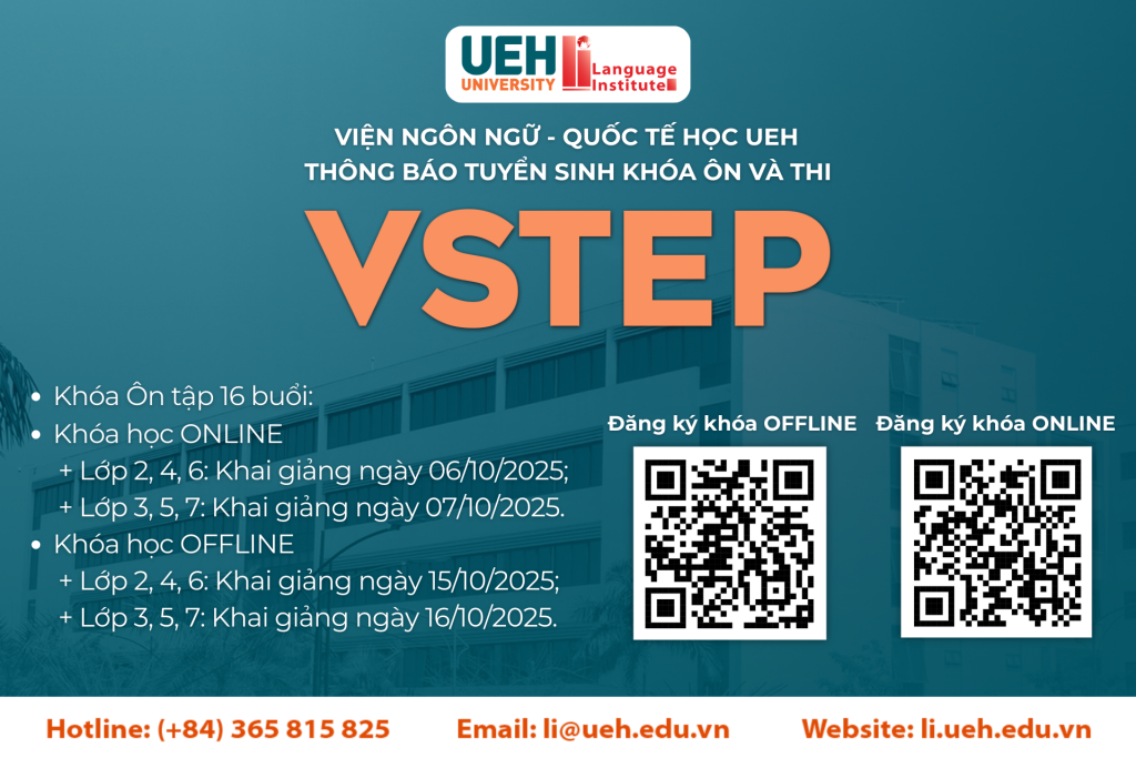 Viện Ngôn ngữ – Quốc tế học UEH (UEH-LI) gửi đến các bạn thông báo khai giảng khóa ôn tập và thi VSTEP đến các bạn có nhu cầu đăng ký khóa ôn và thi như sau: