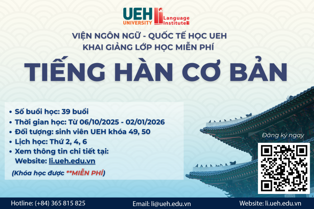 Nhằm đáp ứng nhu cầu phát triển toàn diện cho các bạn sinh viên UEH, Viện Ngôn ngữ – Quốc tế học UEH (UEH-LI) chính thức khai giảng lớp Tiếng Hàn cơ bản hoàn toàn miễn phí dành riêng cho sinh viên UEH. Tại đây, bạn sẽ bắt đầu hành trình của mình từ bảng chữ cái Hangul, làm quen với từ vựng – ngữ pháp thiết yếu và thực hành giao tiếp qua các tình huống hằng ngày như chào hỏi, giới thiệu bản thân, hỏi đường, nói về thời gian, sở thích hay du lịch, …